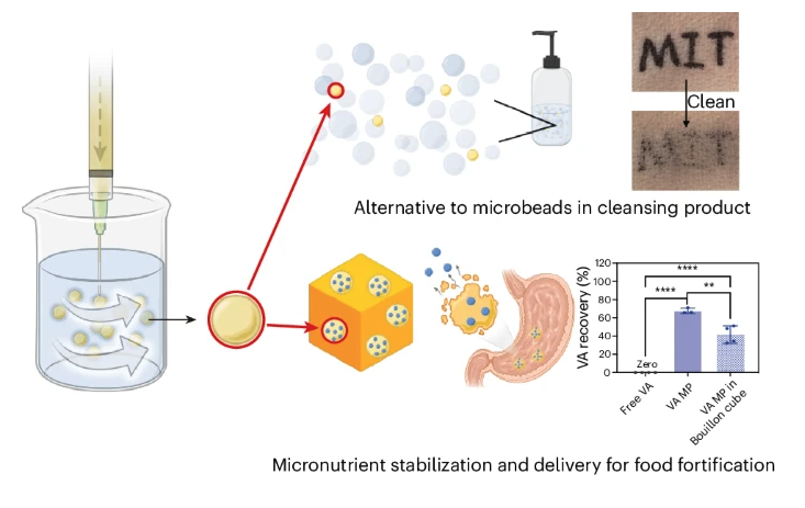 Degradable poly (β-amino ester) microparticles for cleansing products and food fortification, Zhang L., Xiao R., Jin T., Pan X., Fransen K.A., Alsaiari S.K., Lau A., He R., Han J., Pedretti B., Yeo J.Y., Yang X., Olsen B.D., Alexander-Katz A., Smith Z.P., Langer R., Jaklenec A., Nat Chem Eng, 2025